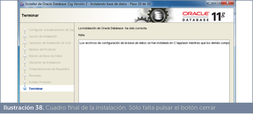 [25]En la última pantalla (si todo ha ido bien), se presentan los datos de la instalación. Esos datos son fundamentales, entre ellos está la dirección del archivo de configuración de Oracle ora.ini y la URL para entrar en el servidor de aplicaciones Oracle Enterprise Manager que nos permitirá administrar la base de datos en modo gráfico.