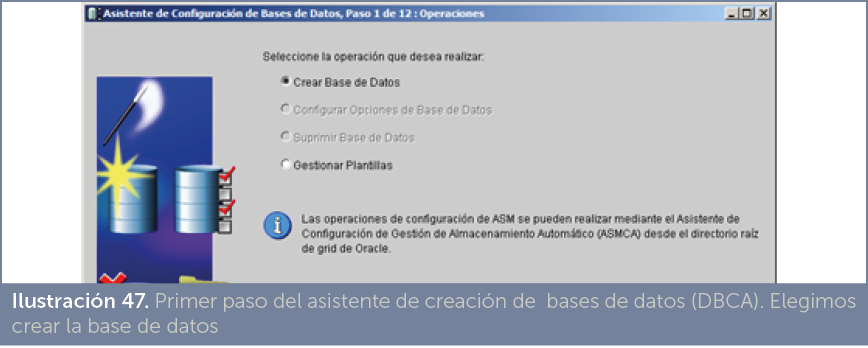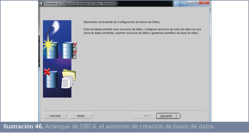[8]El siguiente paso es lanzar el Asistente de Configuración de Bases de Datos (comando dbca), que nos permitirá configurar totalmente la nueva base de datos.