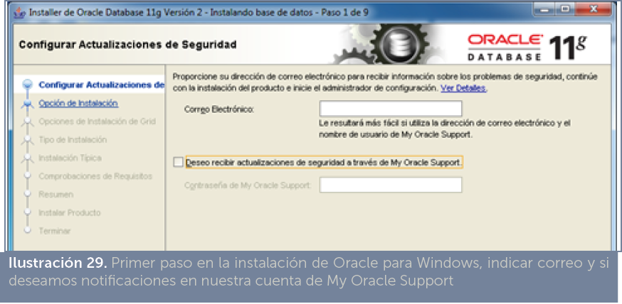[2]Indicar correo electrónico al que Oracle enviará información sobre problemas críticos y si deseamos que nos envíe información de soporte. En una instalación de prueba no se rellena ninguno de estos apartados