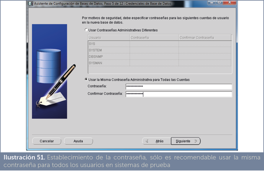 [13]Paso 5. Establecer las contraseñas para los usuarios administrativos (en especial para SYS y SYSTEM). Se puede elegir la misma para todos (válido solo para sistemas en prueba, por seguridad conviene crear contraseñas distintas para cada usuario). SYS y SYSTEM son los usuarios fundamentales.
