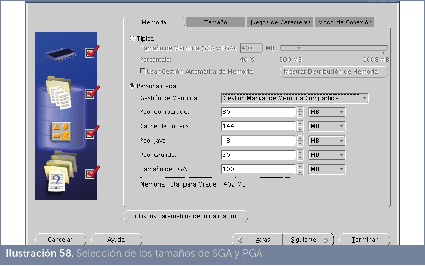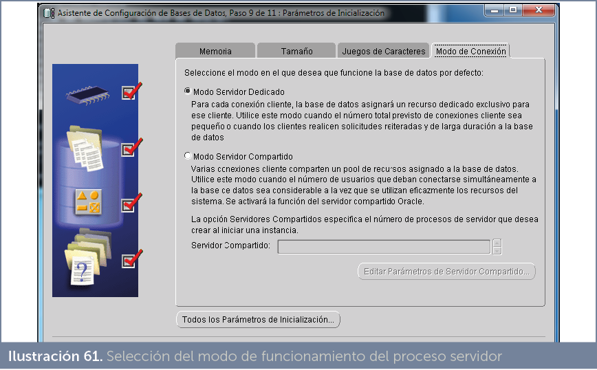 [20]Paso 9. La pantalla siguiente (cuatro pestañas) permiten modificar los parámetros de inicio de la base de datos. La mayoría son opciones avanzadas, hay que manipularlas sabiendo muy bien lo que se hace. Las pestañas son: