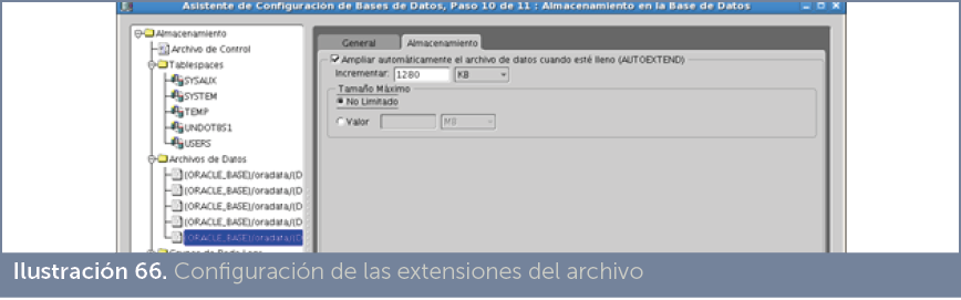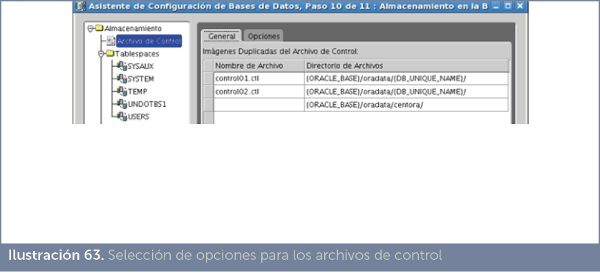 [21]Paso 10. Ahora se puede gestionar la configuración de los archivos (de control, redo, archivados y de datos). Incluida la gestión de tablespaces, tamaños máximos de archivos, auto ampliación del tamaño,… Es muy interesante ver todas las posibilidades de esta pantalla (especialmente permite ver la ubicación de cada archivo): Todos los apartados que permite son: