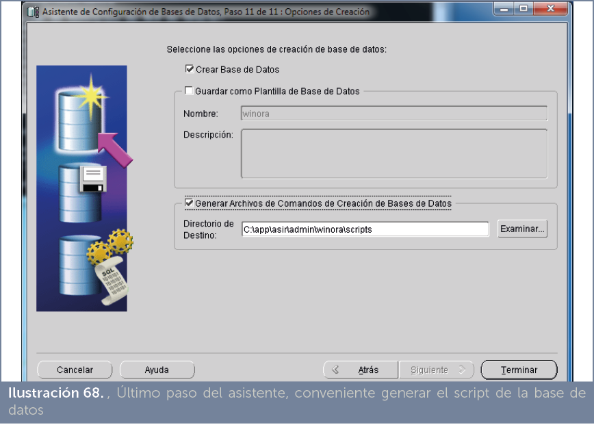 [22]Paso 11 y último del dbca. Elegir Crear la base de datos, En todo caso deberíamos elegir crear script de creación de base de datos y así examinar cómo serían los comandos manuales para crear la base de datos (muy recomendable hacerlo)