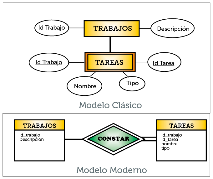 Ilustración 36. Representación clásica y equivalente moderno de una entidad débil