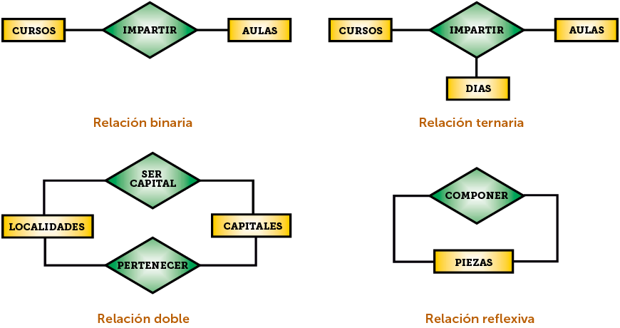 Representan asociaciones entre entidades, es decir entidades de un conjunto que tienen contacto con entidades de otro conjunto. Es el elemento del modelo que permite relacionar en sí los datos del mismo; de otro modo tendríamos información aislada. Por ejemplo, en el caso de que tengamos una entidad personas y otra entidad trabajos. Ambas se relacionan ya que las personas trabajan y los trabajos son realizados por personas.