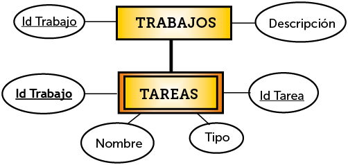 En la Ilustración 27, la relación entre las tareas y los trabajos es 1 a n (cada trabajo se compone de n tareas). Una tarea obligatoriamente está asignada a un trabajo, es más no tiene sentido hablar de tareas sin hablar del trabajo del que forma parte. La relación que tienen las tareas con los trabajos es de debilidad, puesto que no podemos referirnos a una tarea de forma independiente.
