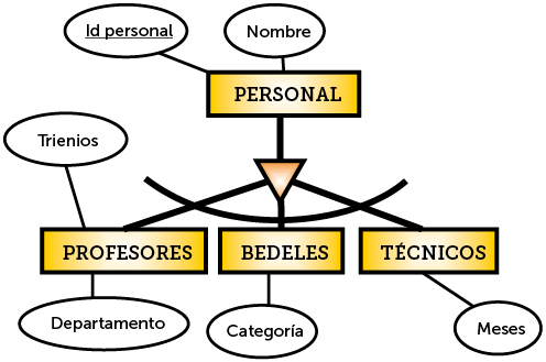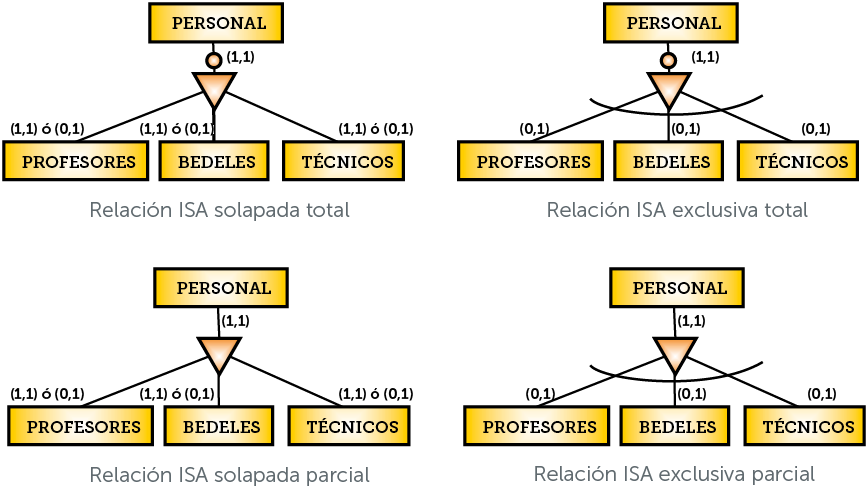 En el ejemplo, el personal sólo puede ser o bedel o profesor o técnico; una y sólo una de las tres cosas (es por cierto la forma más habitual de relación ISA).