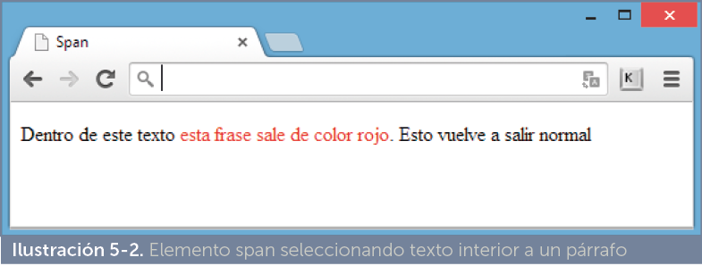 Es muy similar al anterior, pero como los navegadores no agregan nada (ni siquiera espacios) a esta etiqueta cuando se muestra por pantalla, en lugar de para definir capas (aunque se podría) se usa para marcar contenido interior a un párrafo, a fin de que a ese contenido se le pueda dar un formato especial mediante CSS. Es decir, con div marcamos capas (contenedores grandes) y con span marcamos bloques pequeños de texto.
