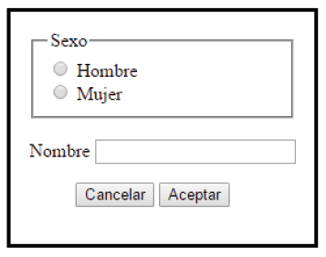 <dialog id=”favDialog” open> <form method=”dialog”> <fieldset> <legend>Sexo</legend> <input type=”radio” id=”hombre” <label for=”hombre”>Hombre</label><br> <input type=”radio” id=”mujer” <label for=”mujer”>Mujer</label> </fieldset> <br> |