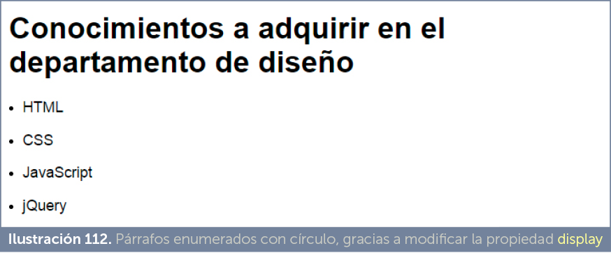 } </style> </head> <body> <h1> Conocimientos a adquirir en el departamento de diseño </h1> <p>HTML</p> <p>CSS</p> <p>JavaScript</p> <p>jQuery</p> </body> </html> |