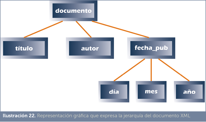 Los elementos de un documento XML establecen una jerarquía que estructura el contenido del mismo. Esa jerarquía se puede representar en forma de árbol.