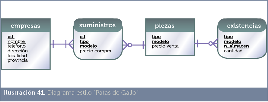 En el diagrama anterior (Ilustración 41) se puede examinar un modelo sencillo estilo pata de gallo. En estos diagramas la cardinalidad máxima n se dibuja con las famosas patas de gallo, la cardinalidad mínima de tipo cero con un círculo y la cardinalidad de tipo uno con una barra vertical. El hecho de que suministros y existencias tengan las esquinas redondeadas es para remarcar que representan relaciones entre entidades (no siempre se remarca).