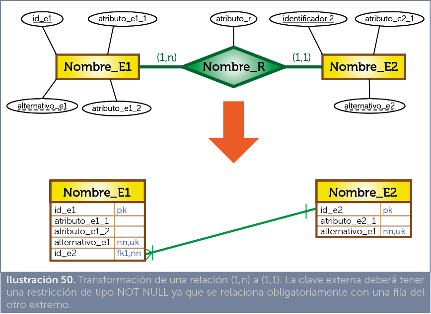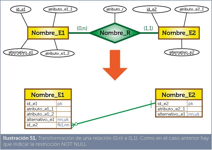 La cardinalidad mínima hay que revisarla bien ya que en caso de que la clave externa se relacione obligatoriamente con la principal (cardinalidad mínima de uno), habrá que indicar una restricción de tipo NOT NULL para indicar esa situación.