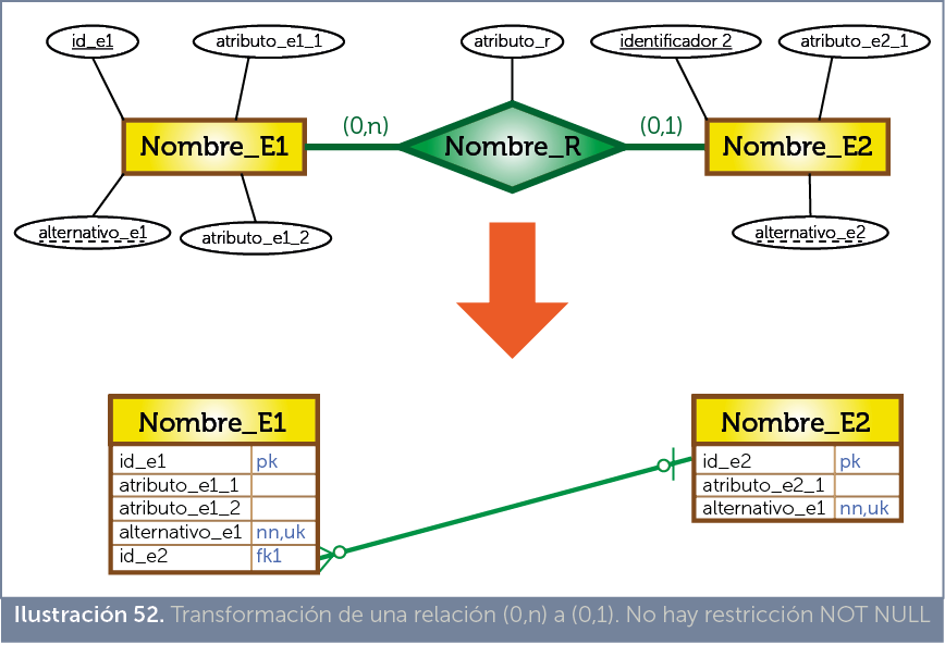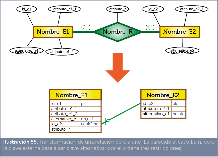 Las relaciones binarias de tipo uno a varios (sólo una cardinalidad máxima vale n) no requieren ser transformadas en una tabla en el modelo relacional. En su lugar la tabla del lado varios (tabla relacionada) incluye como clave externa3 el identificador de la entidad del lado uno (tabla principal).