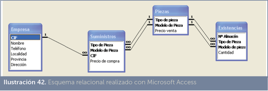 Se ha hecho muy popular la forma de presentar esquemas relacionales del programa Microsoft Access, la cual se puede observar en la Ilustración 42.