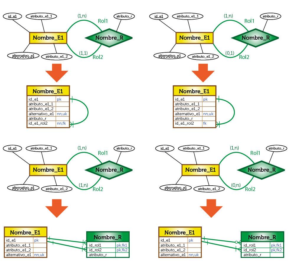 Ilustración 58. Exposición de todas las posibles relaciones recursivas de tipo “1 a n” y “n a n” y su solución al pasarle a un diagrama relacional
