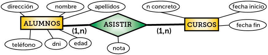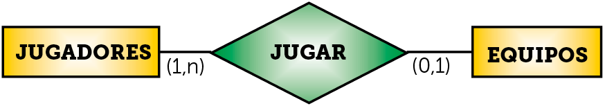 En el ejemplo un jugador tiene una cardinalidad mínima de 0 (puede no estar en ningún equipo) y una máxima de 1 (como mucho está en un equipo, no puede estar en dos a la vez). Cada equipo tiene una cardinalidad mínima de uno (en realidad sería una cardinalidad mínima más alta, pero se anota un uno) y una máxima de n (en cada equipo hay muchos jugadores)