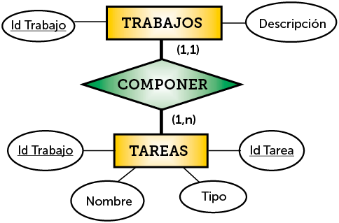 En la Ilustración 27, la relación entre las tareas y los trabajos es 1 a n (cada trabajo se compone de n tareas). Una tarea obligatoriamente está asignada a un trabajo, es más no tiene sentido hablar de tareas sin hablar del trabajo del que forma parte. La relación que tienen las tareas con los trabajos es de debilidad, puesto que no podemos referirnos a una tarea de forma independiente.